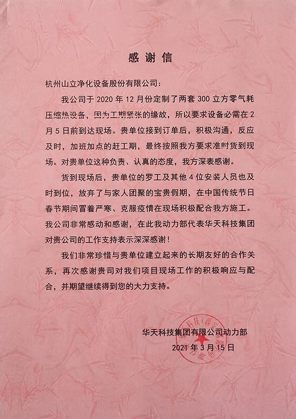 杭州sunbet申搏官方网站净化设备股份有公司收到一封来自华天科技集团有限公司感谢信。信中,华天科技集团有限公司主要对我司的设备生产团队,售后服务团队的全力支持和协助表示感谢。