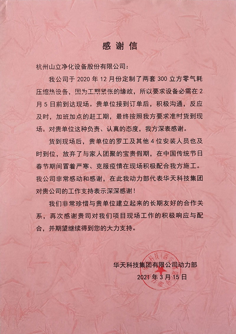 近日,杭州sunbet申搏官方网站净化设备股份有公司收到一封来自华天科技集团有限公司感谢信。信中,华天科技集团有限公司主要对我司的设备生产团队,售后服务团队的全力支持和协助表示感谢。我公司售后服务人员罗文博、王李、刘周洋和车间员工房立香、康等红,他们放弃了春节假期,冒着严寒加班加点,,积极配合客户安装施工,安全、高效、优质地完成了安装调试任务。他们勤奋敬业、踏实务实的工作精神,认真勤勉、专业务实的服务态度得到了客户的认可与感谢。